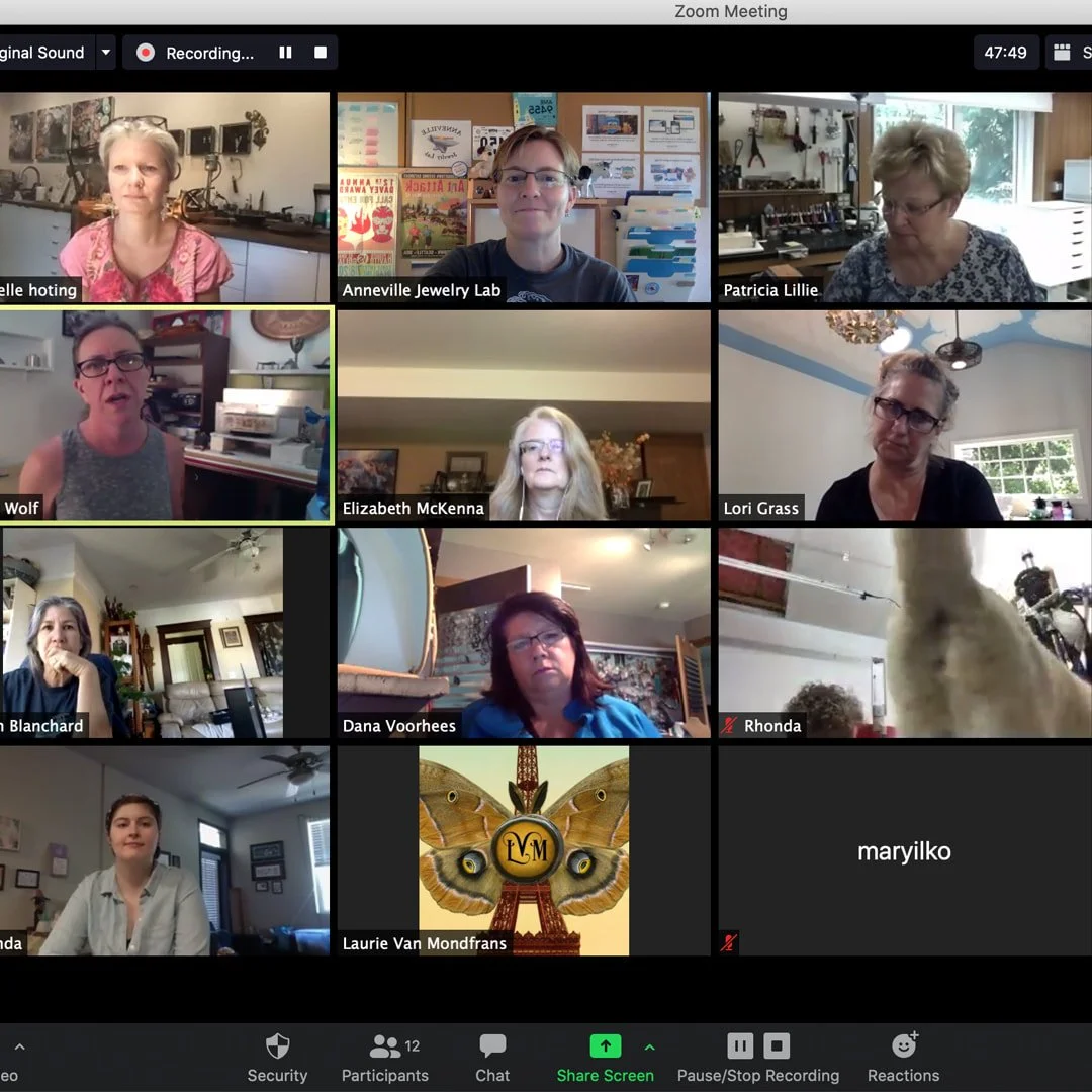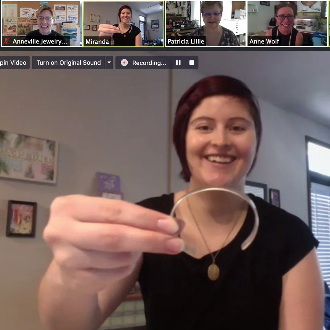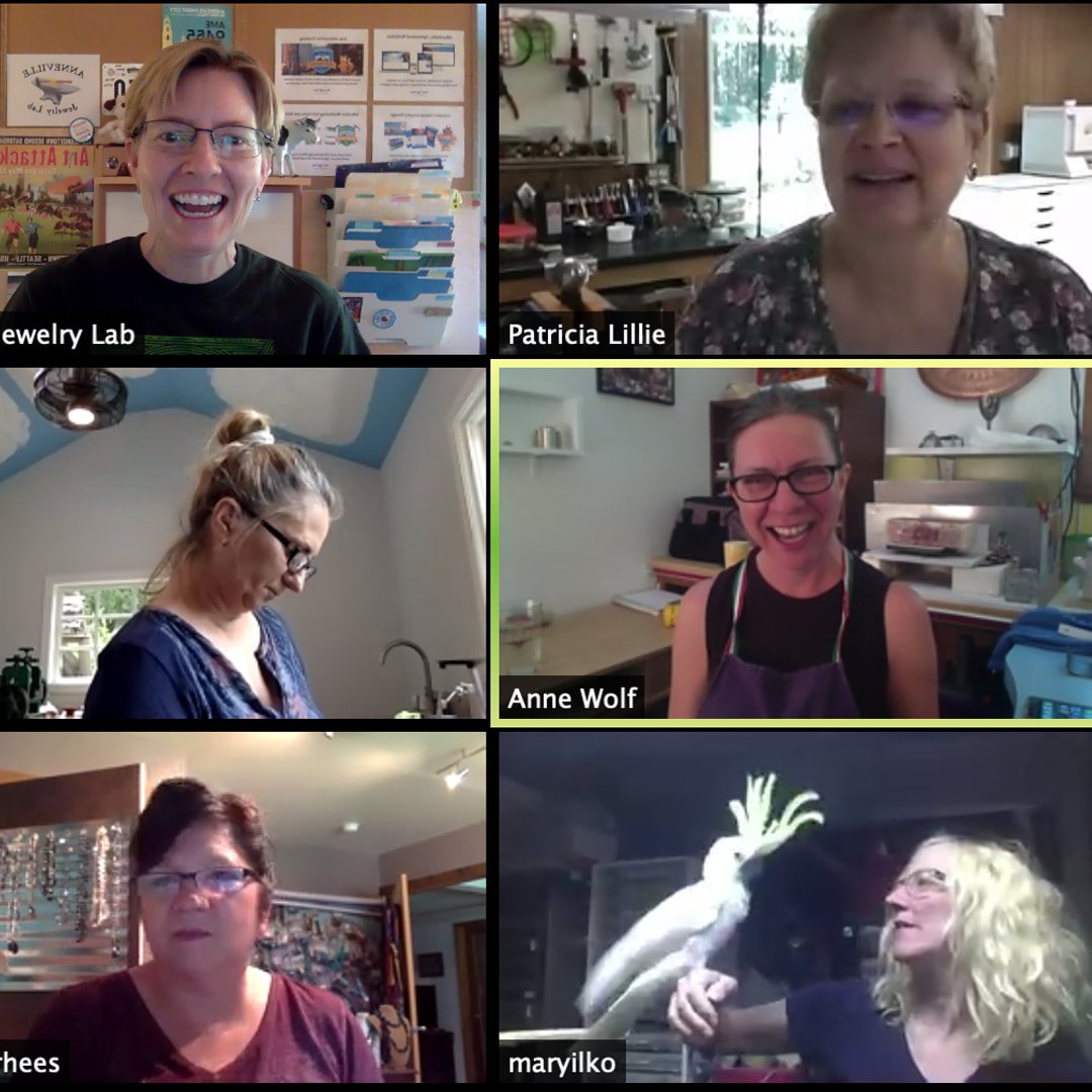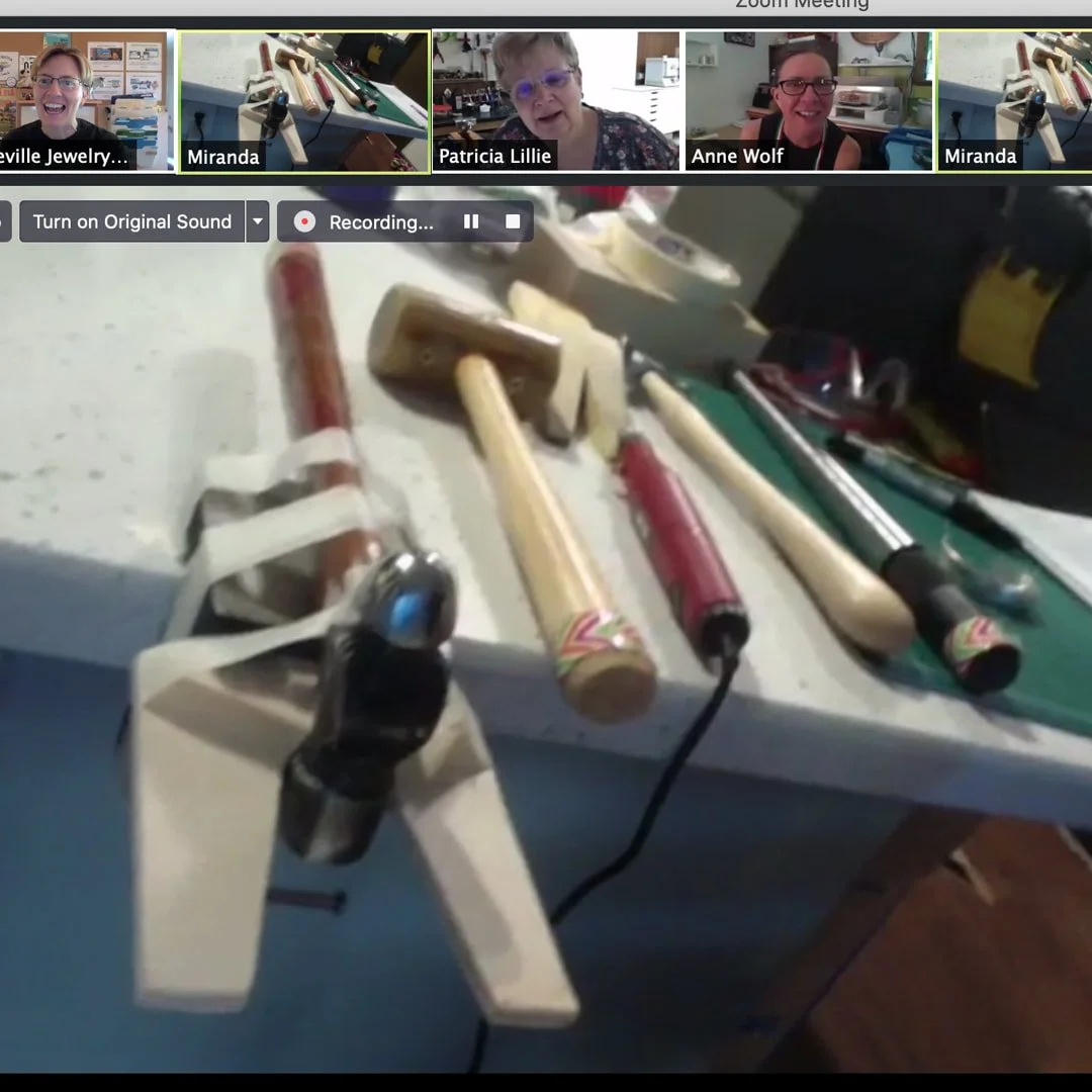 6/15/2020 - Over the second week of June, Anne taught her first online class at Anneville Jewelry Lab to an enthusiastic group of 10 students ranging from San Diego to Georgia all the way to Edmonton, Canada. Blazing ahead through the vagaries of technology, Anne guided the students through the creation of a stunning mokume gane bracelet, and the resulting student works were fantastic! Along with the learning we also had a lot of fun seeing each other's home studios and tools. San Diego local Miranda created a gorgeous bracelet using her very basic but ingenious kitchen table set up of masking tape & ballpeen hammer stake proving that you don't need a ton of tools to make cool stuff. Speaking of tools though, check out Mary's uber-cool mandrel! We also got a kick out of guest appearances by Laurie's dog Rusty (great name for a metalsmith's dog-LOL!), Jasper the very fabulous cockatiel and various cats - who unequivocally let us know exactly what they thought of the whole thing. Read on for more photos and Anne's thoughts on the class.