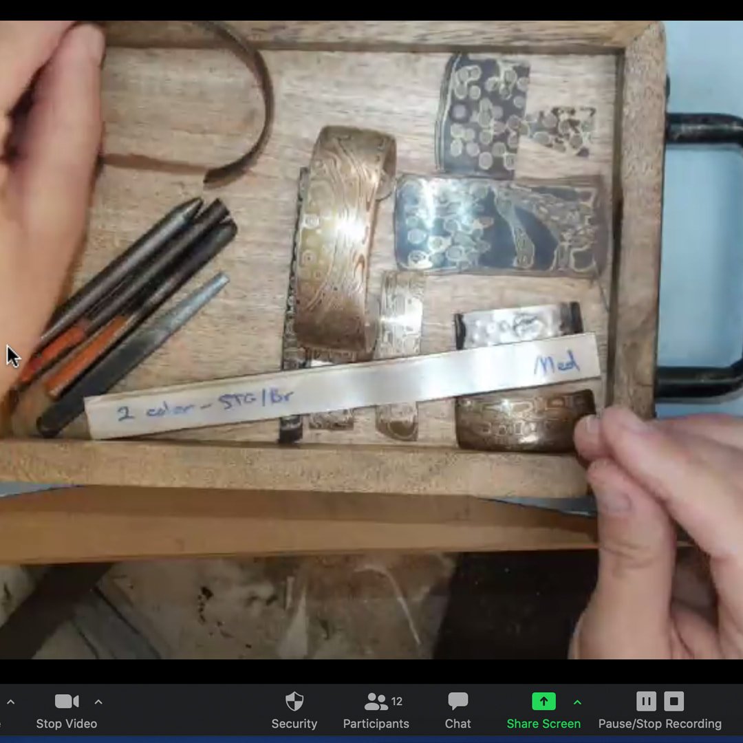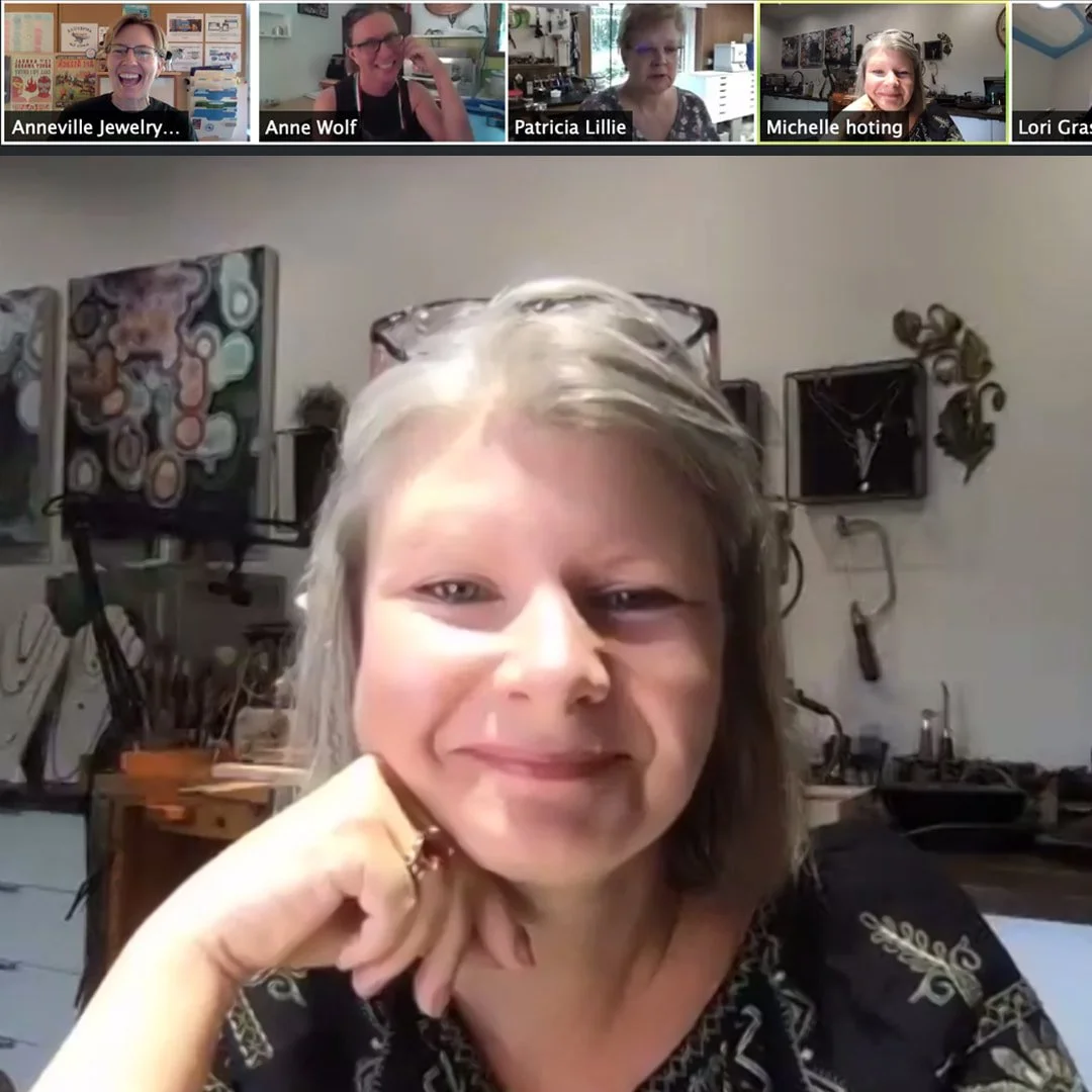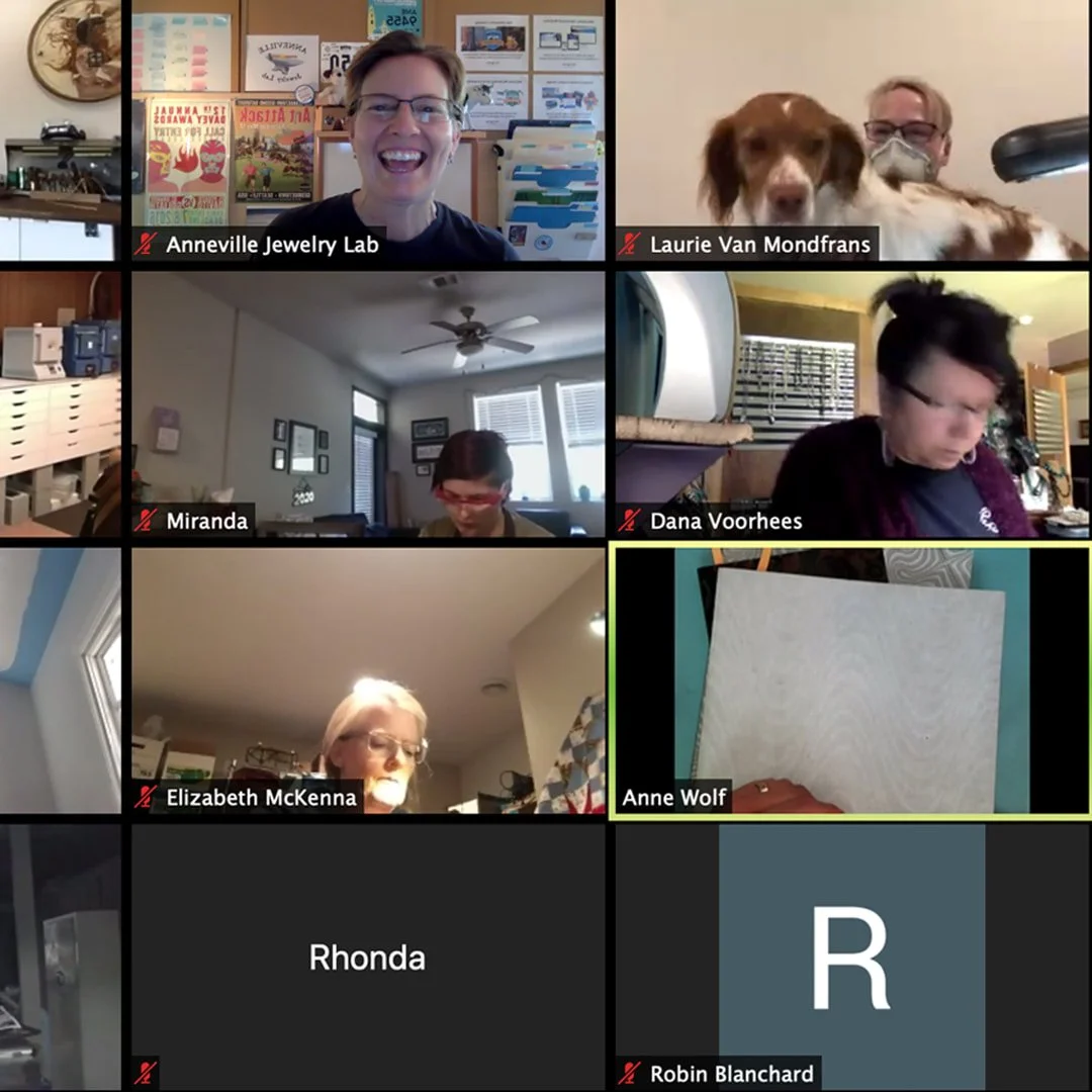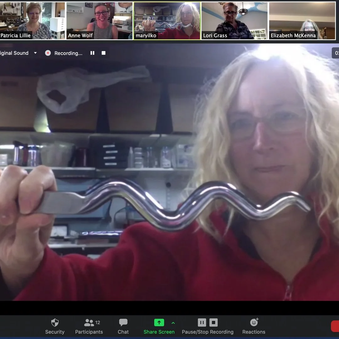 6/15/2020 - Over the second week of June, Anne taught her first online class at Anneville Jewelry Lab to an enthusiastic group of 10 students ranging from San Diego to Georgia all the way to Edmonton, Canada. Blazing ahead through the vagaries of technology, Anne guided the students through the creation of a stunning mokume gane bracelet, and the resulting student works were fantastic! Along with the learning we also had a lot of fun seeing each other's home studios and tools. San Diego local Miranda created a gorgeous bracelet using her very basic but ingenious kitchen table set up of masking tape & ballpeen hammer stake proving that you don't need a ton of tools to make cool stuff. Speaking of tools though, check out Mary's uber-cool mandrel! We also got a kick out of guest appearances by Laurie's dog Rusty (great name for a metalsmith's dog-LOL!), Jasper the very fabulous cockatiel and various cats - who unequivocally let us know exactly what they thought of the whole thing. Read on for more photos and Anne's thoughts on the class.
