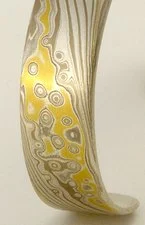 8/25/2015 - A few weeks back I finally got a chance to work on a mokume gane billet I fused in February - at a Rio Grande workshop with James Binnion and Chris Ploof. I was anxious to see if it held together and if my billet design was a good one. I'm pretty pleased with the result, and am again eager to tool up for fusing precious mokume. That's my fall project for sure. I absolutely love the color contrast possible with the 22k yellow gold layers. The gray layers are 14k palladium white gold, the silver are sterling silver. This bracelet style is one I've been making in copper, silver and shibuichi for some time now - (see one in my Etsy Shop) but this is my first gold one. And for now, this prototype is mine. All mine... :)