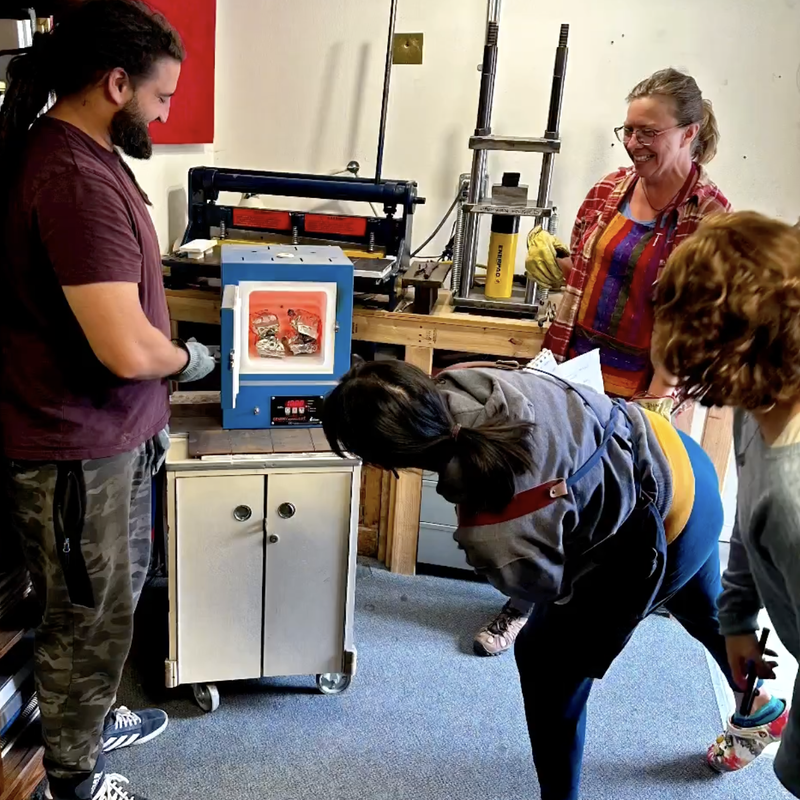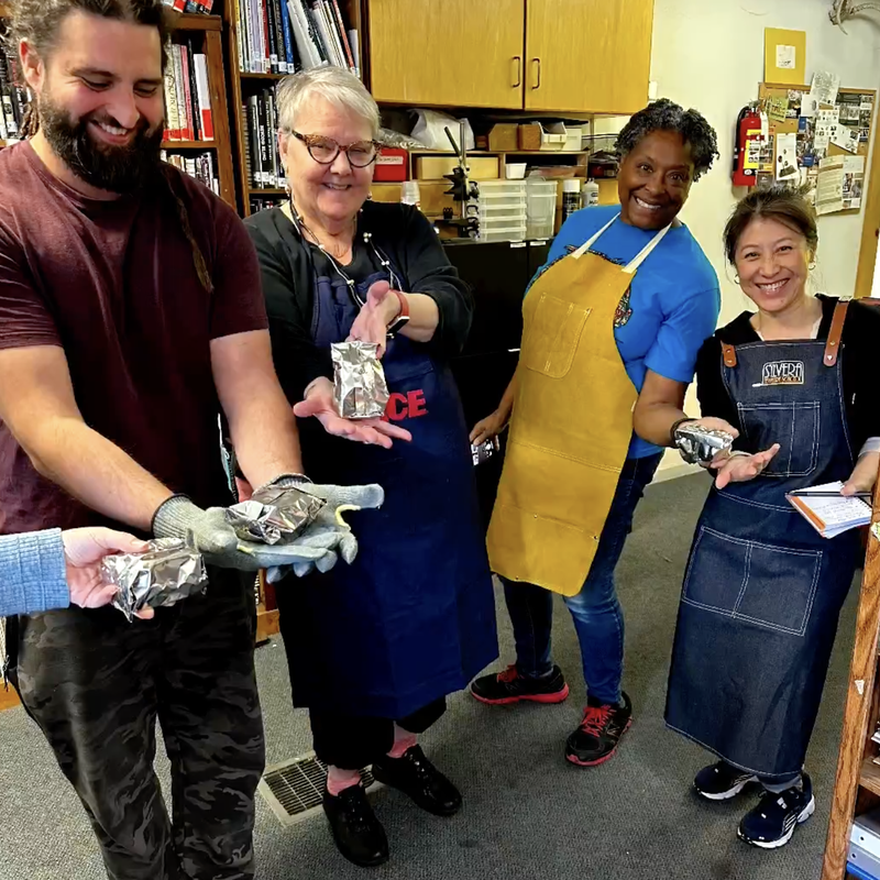 Fusa-palooza - Happy students with their billets in bags (so much scrubbing not pictured here), putting bags in the kiln, trimming billet edges, forging the billets down, then finally rolling to sheet and rod.