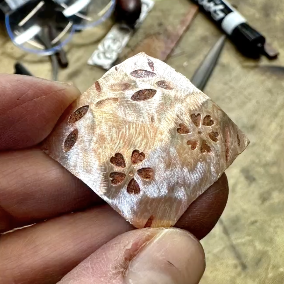 Patterning begins! Cherry blossom in progress, filing and sanding, annealing, liver of sulfur patina, eager students have a first look at their finished patterning samples.