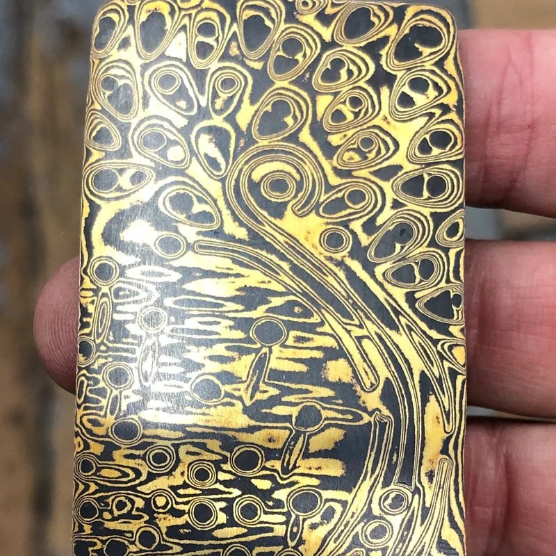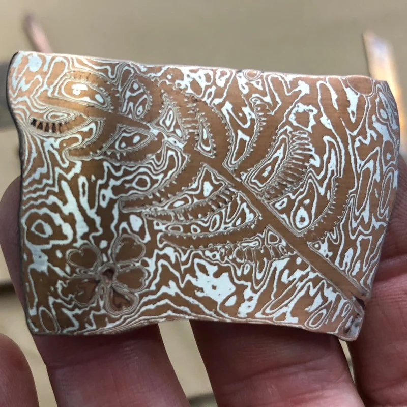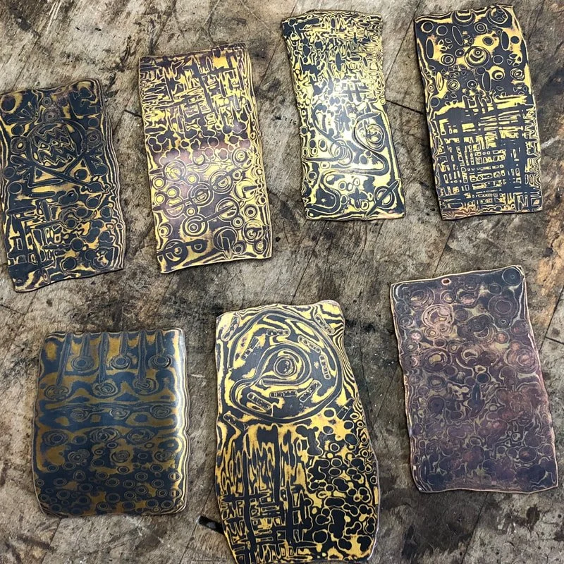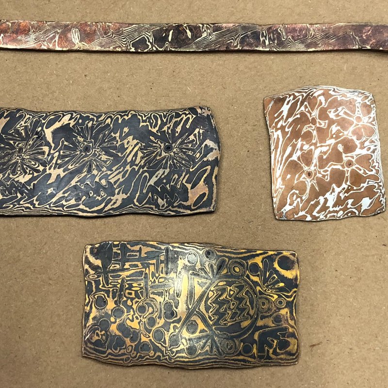 Great job! Metamorphic, direct hammer, and twist patterning from 8 different students shown here. I think this crop of students understood and were able to duplicate the cherry pattern better than any of my previous classes. Some even conquered the concept and used the principles to create new designs - especially the the 'peacock tree' center top, and the silver/copper fern bottom left. Part of their success was due to it being an in-person class - it was so much easier to keep an eye on their progress and make sure their hammer marks were deep enough before moving on to the next step.