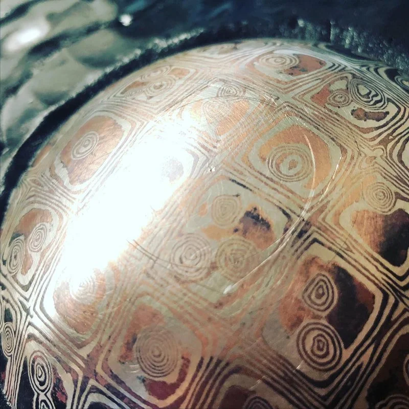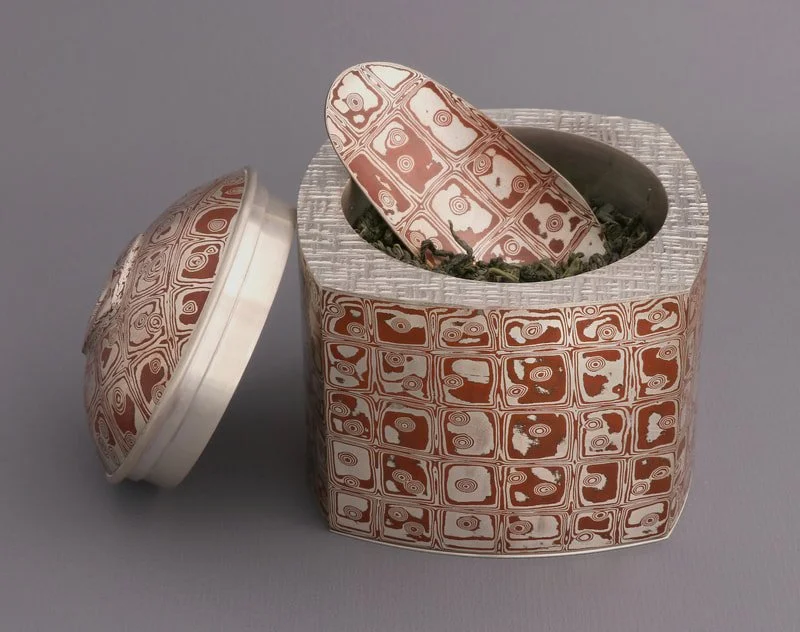 Creating matching mokume patterns isn't easy - I used three different billets to create all of the silver/copper mokume you see here. It's all chisel and drill patterned. Patterning was done first, then the sheet cut and curved, soldered and fabricated just as if it were one metal - except great care must be taken not to overheat the mokume. The silver sections are 1mm thick sterling silver, some of it with a heavy cross-hatch texture to complement the mokume pattern. I do a lot of modeling in paper first, to test out different proportions, understand how much mokume I'll need and how the patterns will match up, etc. It is patinated with rokusho, the most traditional Japanese patina for mokume. It is easy to use, really quite functional. Pictured with a lovely gunpowder green tea (not included). There is also a secret (shh!) compartment accessed from underneath, great for hiding special things. Does include the matching tea scoop. I am considering making additional tea scoops for sale, let me know if you're interested.
