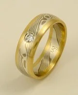 11/12/2014 - My most recent custom piece was a joy to make. A fellow came in to my studio wanting a memory ring to honor his recently departed wife. We worked from the starting point of the rings that they wore during 37 years of marriage. At right is the design we came up with. The 14k yellow gold edging is those actual three rings, which I melted down together then rolled and fabricated into two bands. The center stone is the diamond he most wanted to incorporate - from the smaller ring, the one he had bought for her when they first married. The central mokume gane band and diamond represent their connection - separated by planes of existence for now, but always connected. I was honored to help him remember his wife in this way.