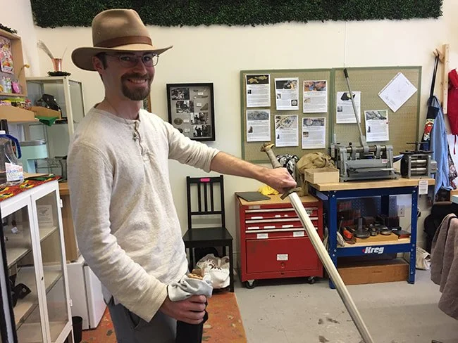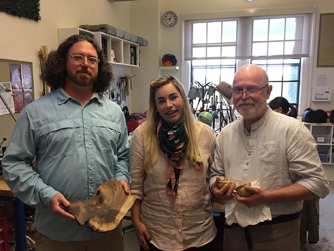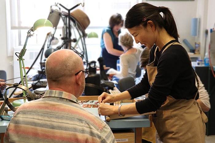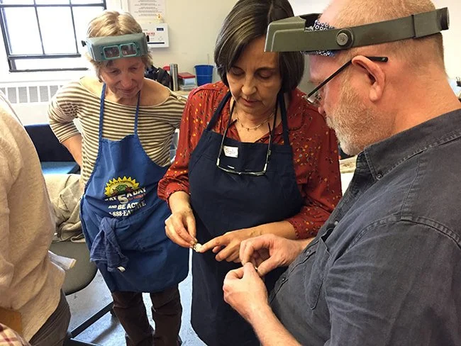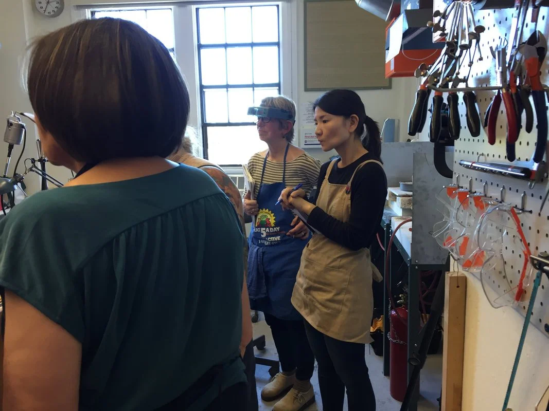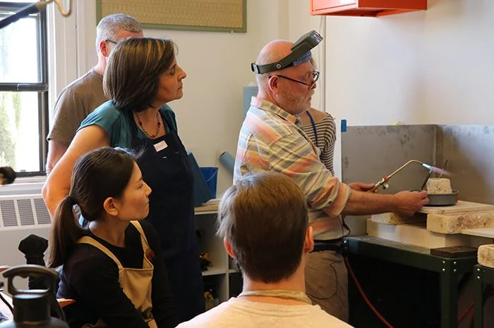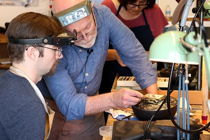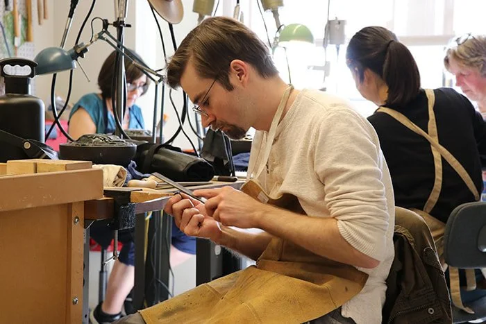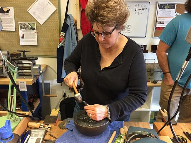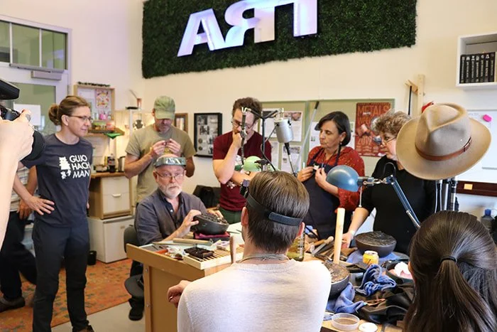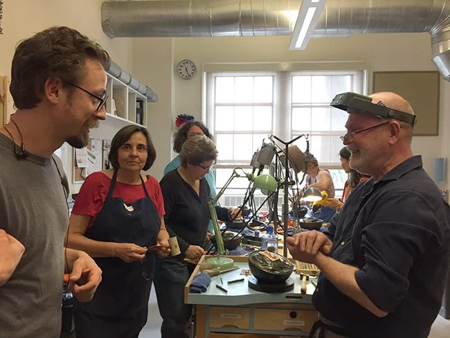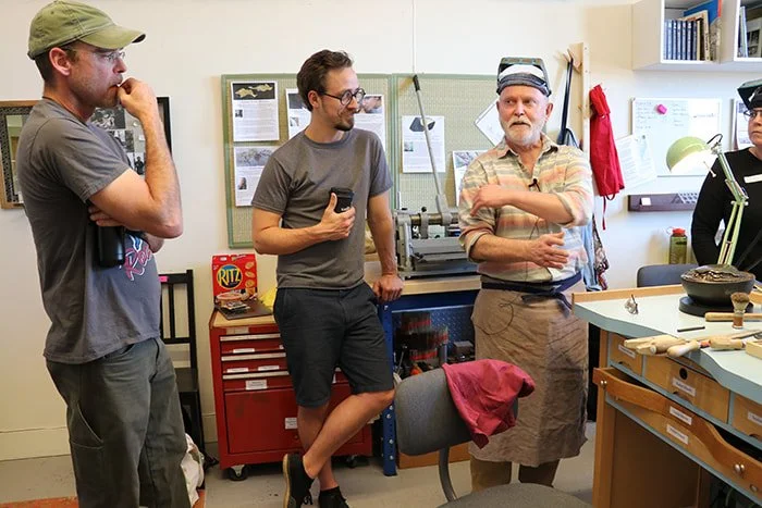 4/25/2019 - The second week of Ford Hallam's visit to Anneville got off to a great start. We had a Meet & Greet at Stone Brewery on the Sunday evening, and learned we had an eager and impressive crew - more jewelry/metals teachers, classically trained jewelers, folks with tons of experience in chasing & repoussé, even a bladesmith and Forged in Fire champion! From then until the last hour on Friday, the participants were a joy to be around - ambitious, focused, hard-working, talented, and funny too. We've already got plans for a few of them to return as visiting artists themselves. Here are photos and a recap of what they learned and created. Click images to view larger.