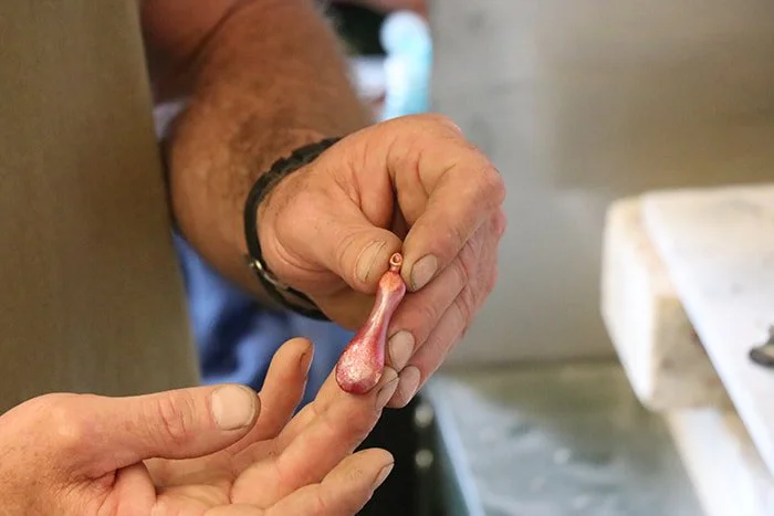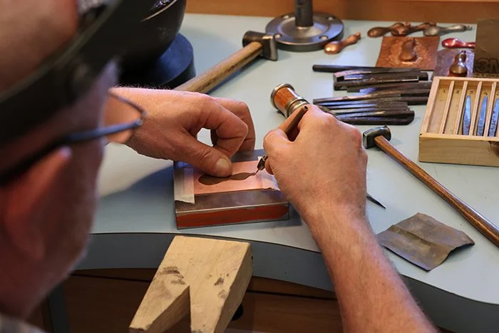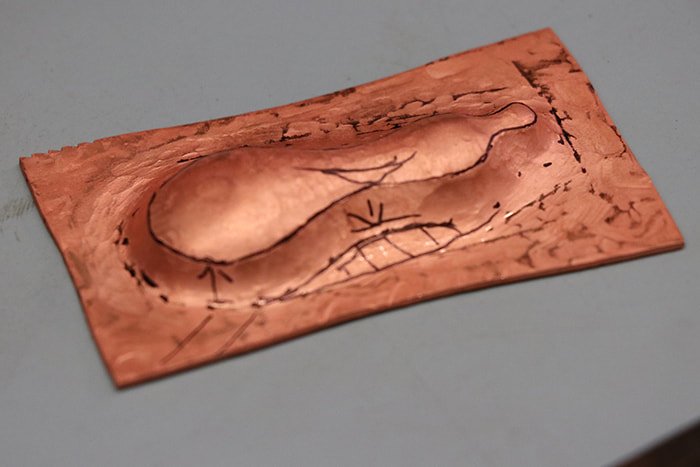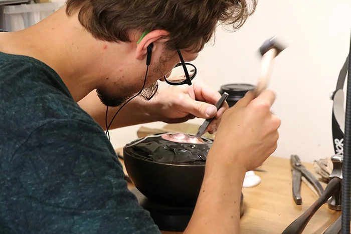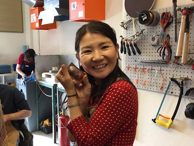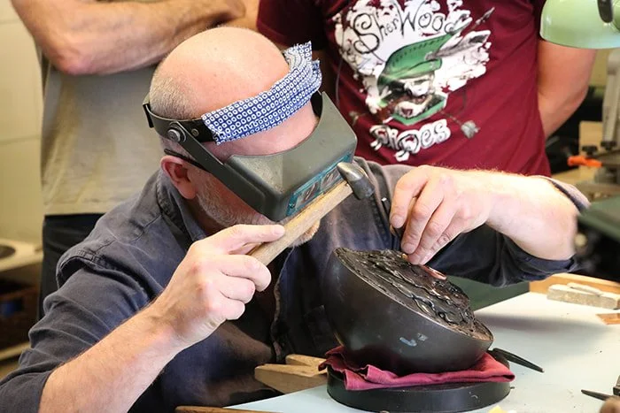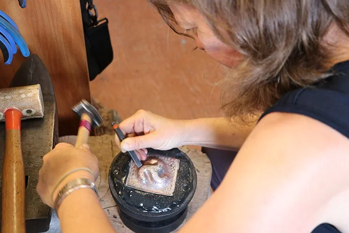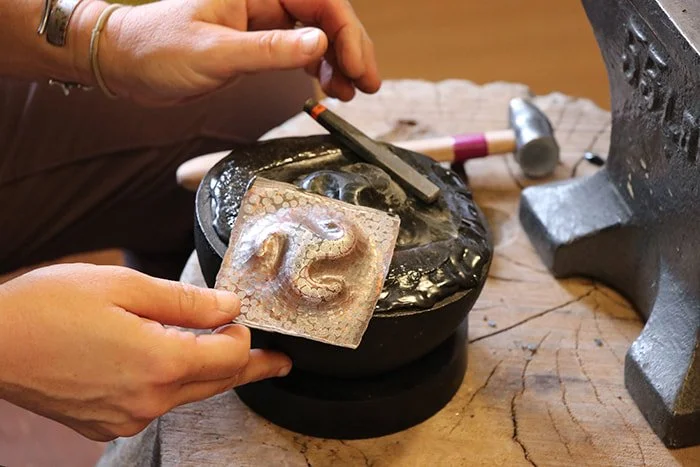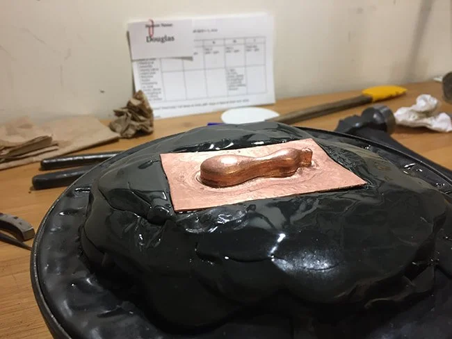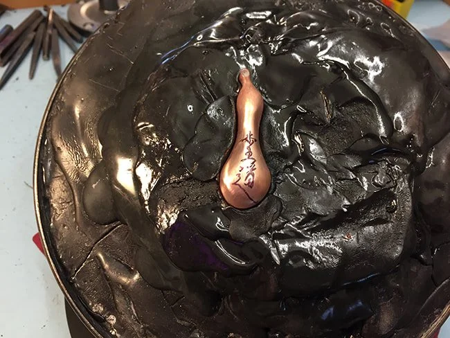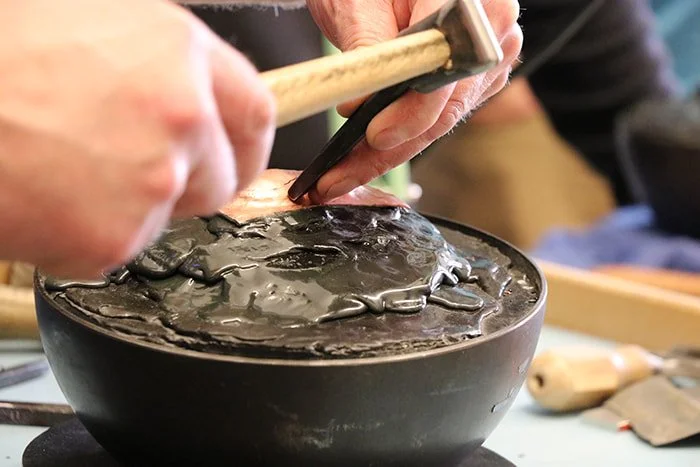 It was clear that participants found the process of uchidashi absorbing and addictive. There is something satisfying and magical about watching the form take shape beneath the tools. The copper starts out flat, then has a very vague oval bumped up from the back. Once in the pitch, the bump gets hammered down using the various punches, slowly gaining more detail, almost like a low resolution image coming more and more into focus.