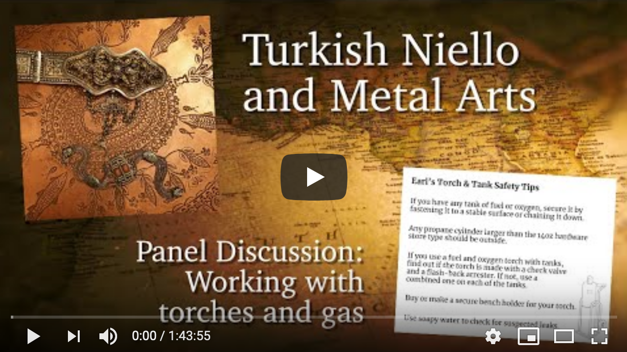 11/19/2020 - Anne Wolf is our guide this month for a fascinating photo journey into the gorgeous niello work of southeastern Turkey. This time she'll discuss several striking pieces from her collection, all purchased during her trip to the region in 2005. After that, we take a deep dive into a topic many of you have burning questions about... working with torches in your home studio - specifically working with gas. Which type is best? Where do you buy tanks? How do you safely store them? What about insurance? What about oxygen concentrators?!? Read more for resource links and photos!