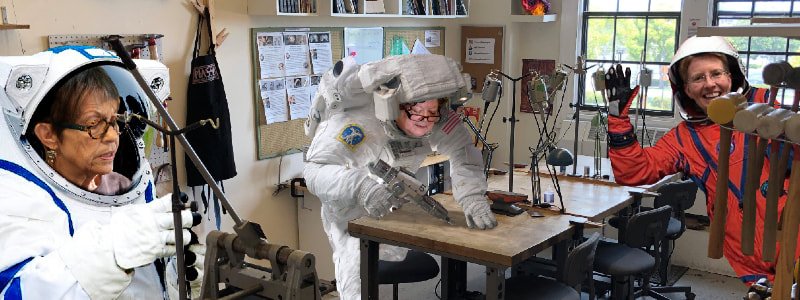 5/26/2020 - While spacesuits might not be too practical to implement, please know that we are brainstorming like mad to come up with ways to move forward. There is a lot of talk about acceptable levels of risk out there. Well, the "acceptable" number of students getting COVID in our space is zero, so we will not be opening the Lab if there is a risk to the people involved. Seeing Jean's and Karen's smiling faces makes me realize even more how much I miss all of you. That is one reason why we are starting MAAA (Metal Arts Adventures with Anne) on Thursday nights. We want to get back to the great community of the Lab - right now that needs to happen online, because we care about you. We also have more online classes in the works, and I look forward to talking with all of you on Thursday nights about what you might like to see added to the schedule. - Anne
